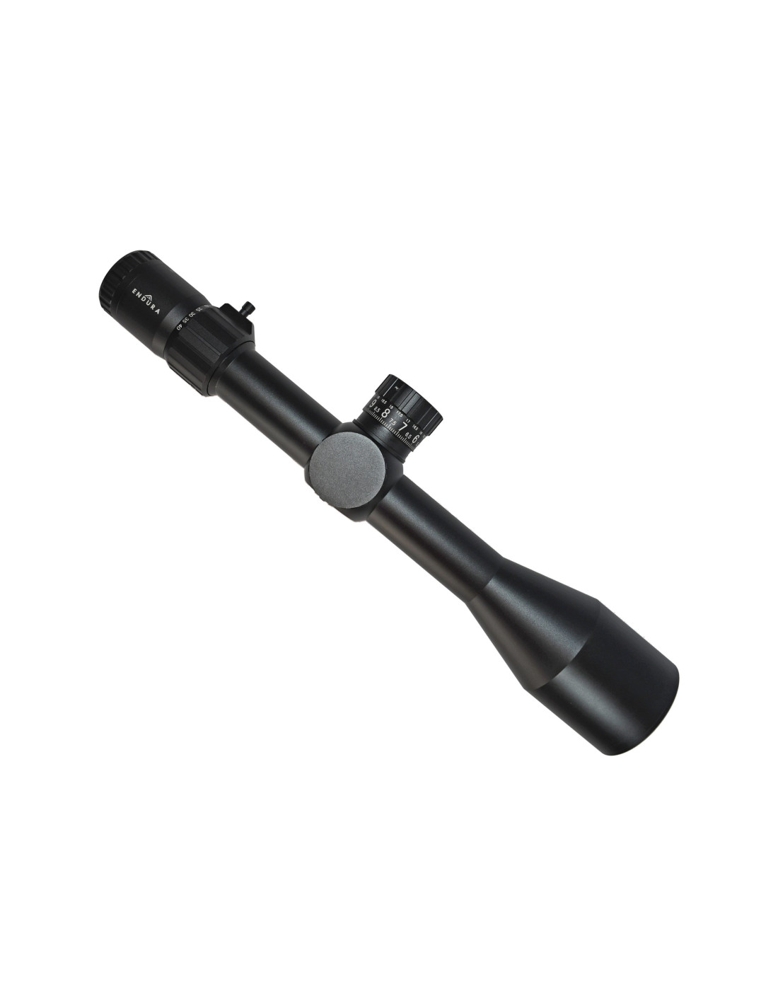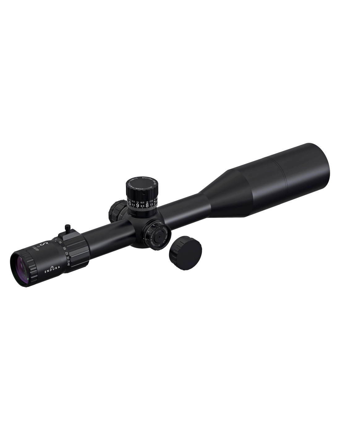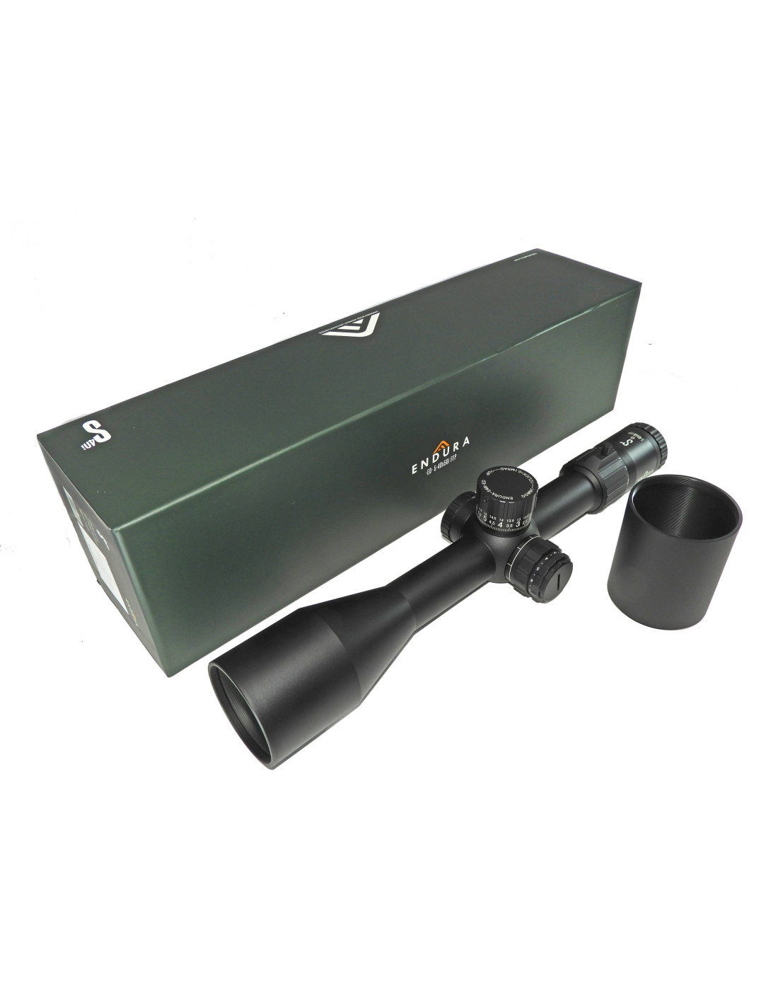 Visor de competición FFP de muy alto aumento con cristal HOYA FCD1A ED. Construido alrededor de un tubo principal de 34 mm con tope de cero sin restricciones y recorrido de elevación de 30 MRAD. Paralaje lateral de 10 m al infinito.
