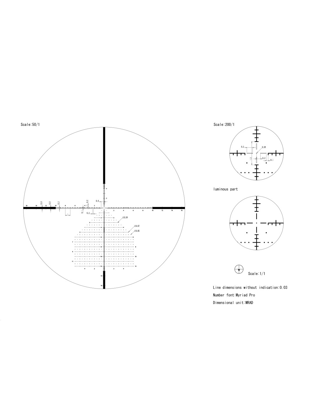 - Rango de recorrido de elevación de 30,0 MRAD (+100,0 MOA) con 0,1 MRAD por clic y 10,0 MRAD por giro