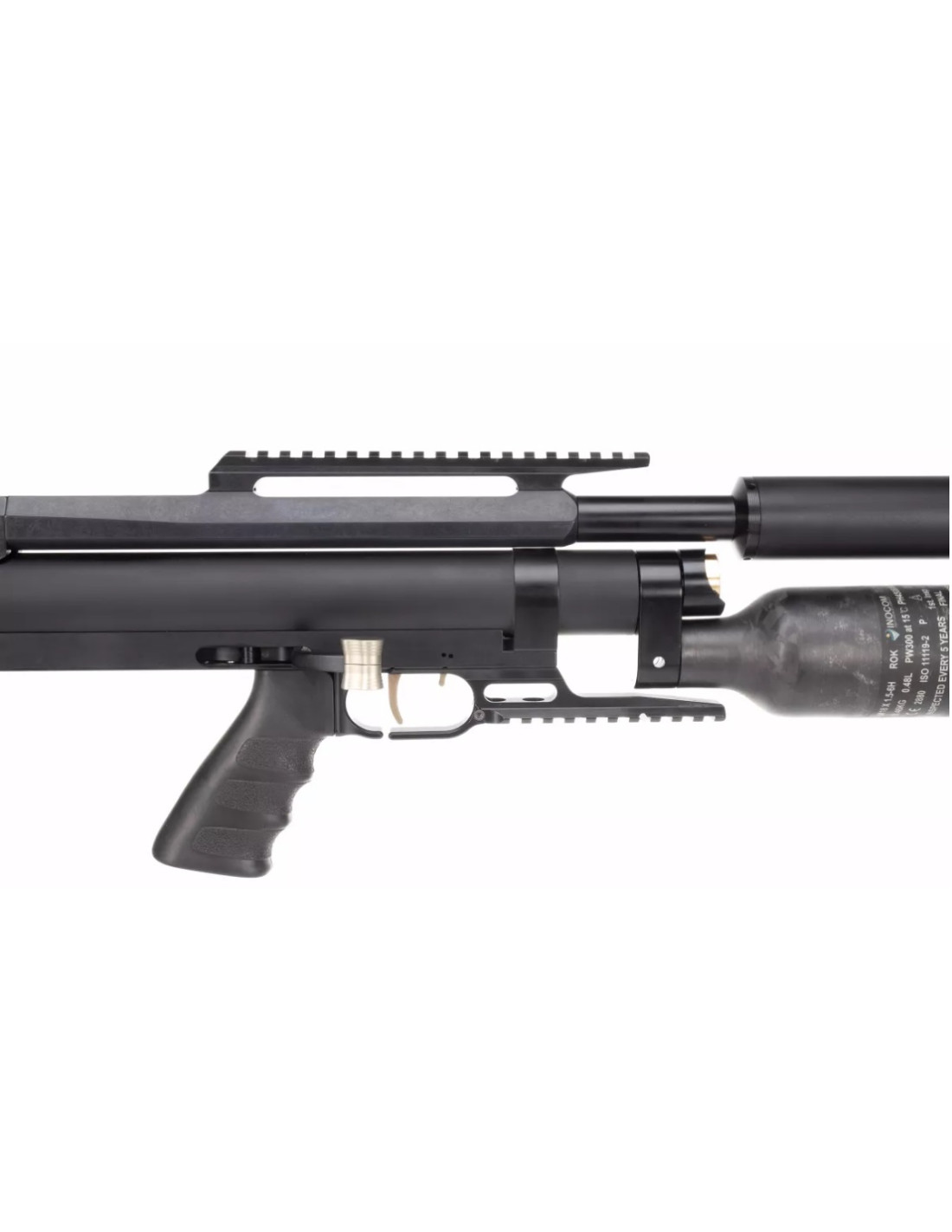 El rifle viene equipado con una botella de aire comprimido de kevlar de 480 cc . La presión máxima de trabajo es de 300 bares y el regulador de presión se ha optimizado para un mayor rendimiento.