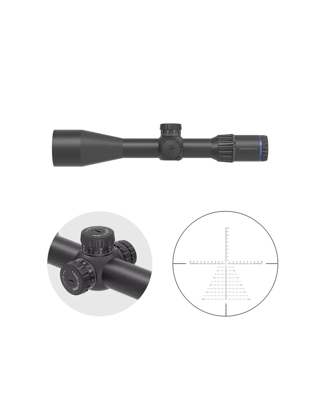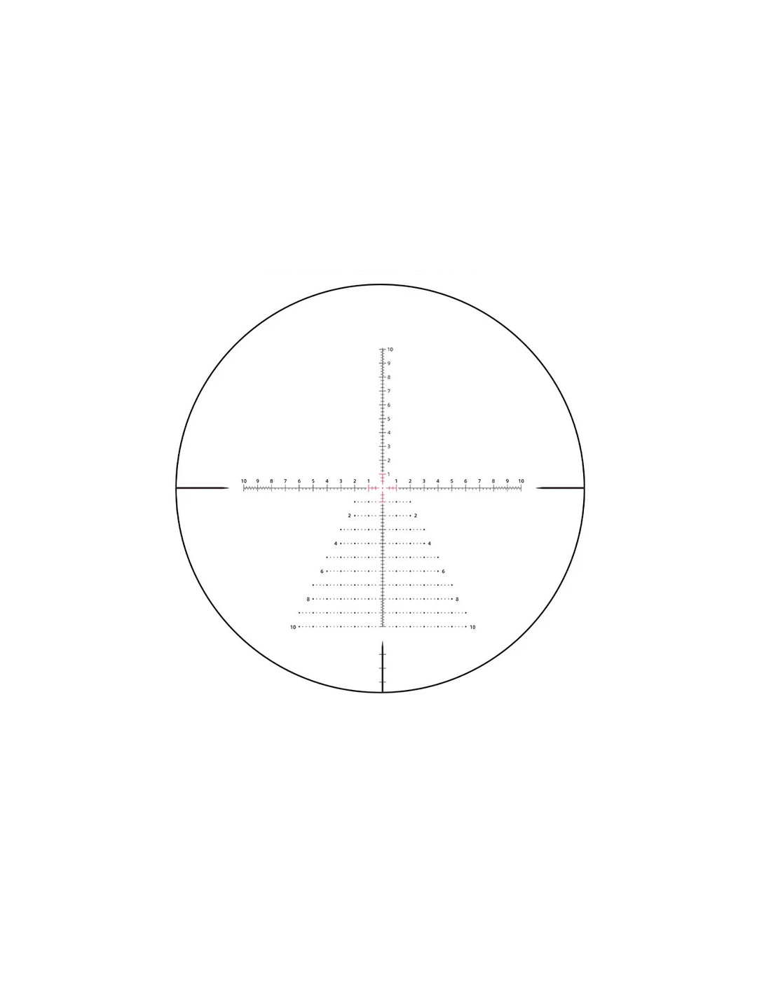 Este visor incorpora retícula en primer plano focal (FFP), lo que significa que las referencias de la retícula mantienen su valor real en cualquier nivel de aumento. Esto permite realizar correcciones precisas de caída y deriva sin necesidad de cálculos adicionales al cambiar la magnificación.