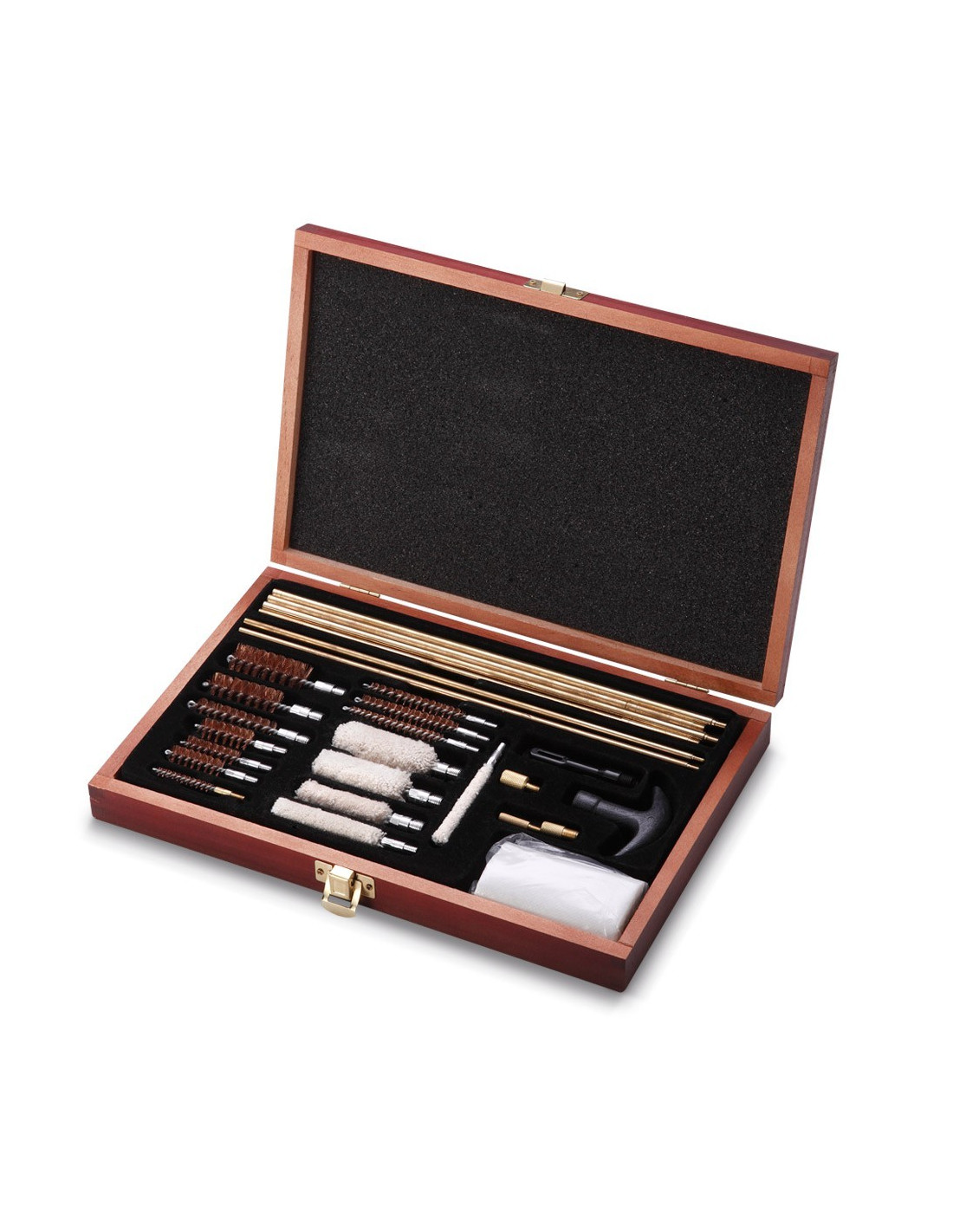 Kit muy completo para la conservación y limpieza de armas de distintos calibres presentado en maletín de madera maciza con interior acolchado y cierre metálico que incluye más de 20 piezas.
